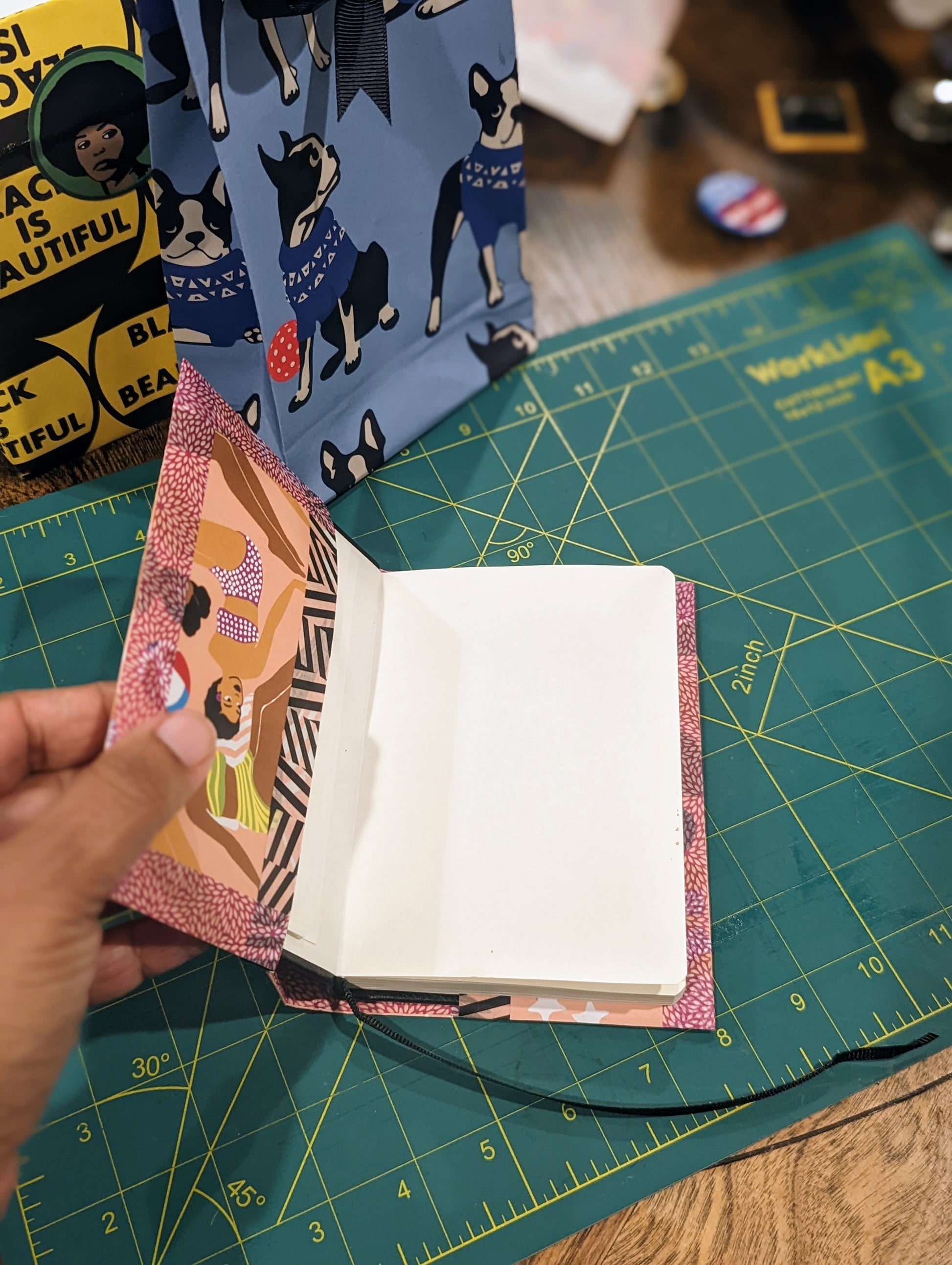 This is about fun. Please don't expect finished covers to look like they were made in a notebook cover factory. The joy should be in the making. Feel free to shoot me a message if you have any questions!